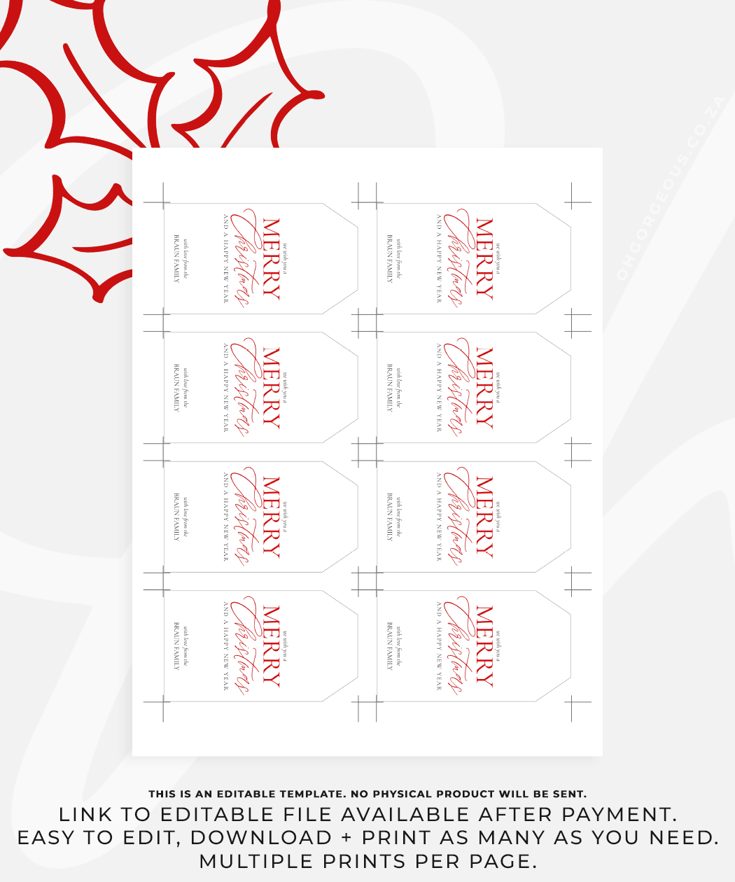 File Information: 50,8 mm width x 88,9 mm height (2 inches x 3.5 inches) Modern Holiday Gift Tag Template. Edit, Save and Print at home or at a print shop. Multiples prints per page.